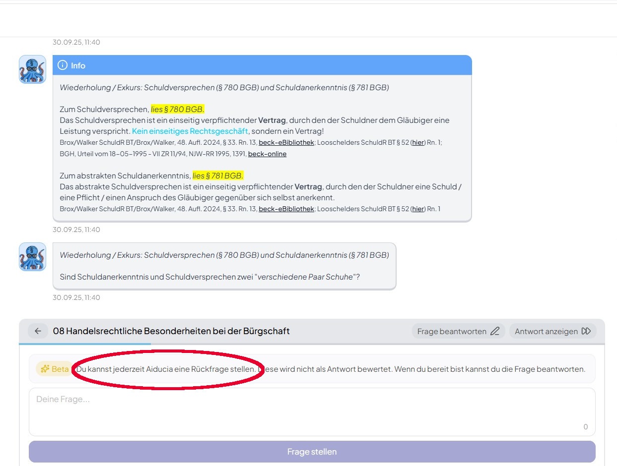 Der Name Aiducia ist eine Kombination aus „AI“ (Artificial Intelligence) und „Fiducia“ (lateinisch für Vertrauen). Er steht für das, was uns ausmacht: Künstliche Intelligenz, der Du vertrauen kannst – beim Lernen, Verstehen und Wiederholen juristischer Inhalte.