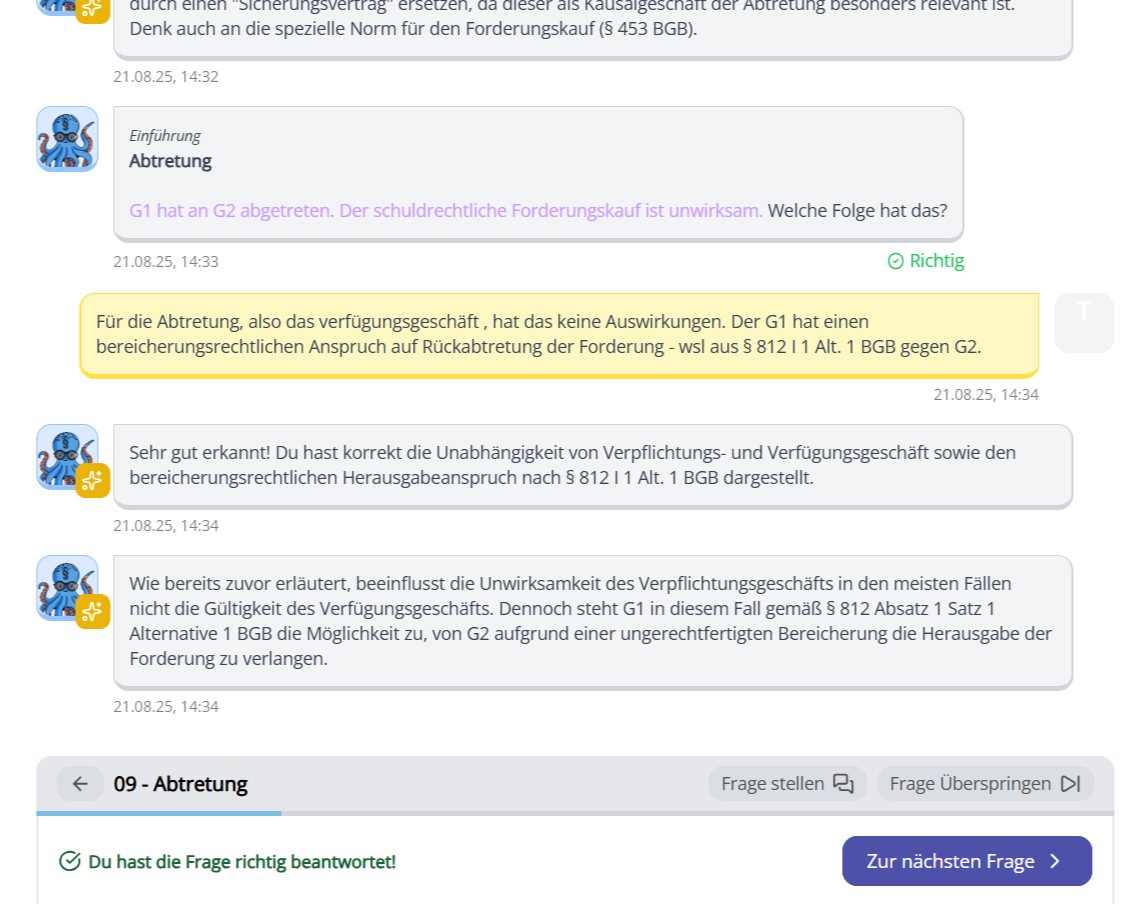 Klicke oben auf den Button „Jetzt loslegen“ und erstelle Dir einen Account – kostenlos und unkompliziert. Wähle das Thema (BGB AT, Immobiliarsachenrecht, …) und das Niveau (von BWL über Grundwissen bis Examen) und los geht’s im Lernchat.